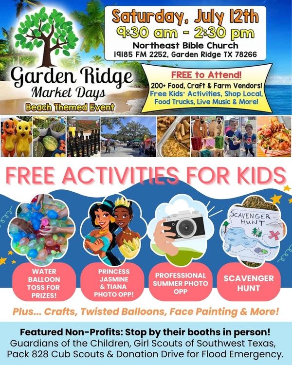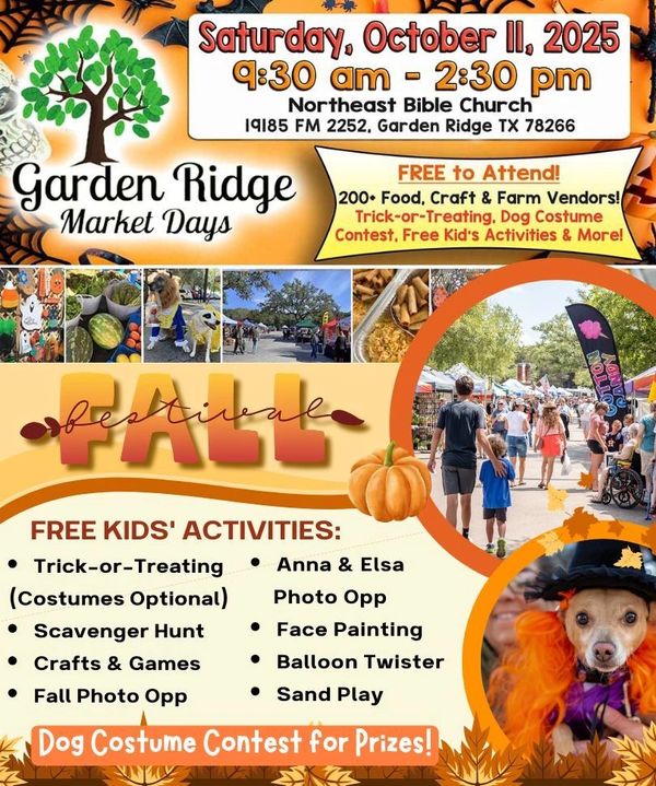 Garden Ridge Market Days is the largest FREE, family-friendly pop-up market in the San Antonio area. Join us every 2nd Saturday monthly to enjoy 200+ local food, farm & craft vendors. You'll find food trucks, sweet treats, live music, free kids' activities & more! We have vendors INDOORS & OUTDOORS!! :)